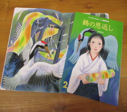 昔、お爺さんが畑で羽に矢の刺さった鶴が苦しそうに飛んできたので、お爺さんは矢を抜いて助けてあげました。その日の夜、お爺さんの家に美しい娘が訪ねて来てお爺さん、お婆さんと一緒に暮らすことになりました。幸せな日が続いたある日「布を織らせてください。私が布を織る姿を絶対に見ないでください」と娘は言い美しい布を織りました。お爺さんは娘の布織る姿が気になり隙間からのぞいてしまうと。。
